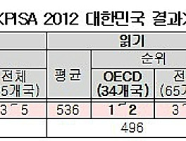 대한민국이 경제협력개발기구(OECD) 34개 국가 가운데 수학, 읽기, 과학 부문 학업성취도에서 최상위권을 차지했다. 교육부는 현지 시간으로 3일 오전 11시(프랑스 현지 시간, 한국 시간 오후 6시) OECD가 위와 같은 내용을 담은 OECD 학업성취도 국제 비교 연구(PISA) 2012 결과를 공식 발표했다고 전했다. PISA는 만 15세 학생들의 수학, 읽기, 과학 소양 수준과 추이를 국제적으로 비교하고 교육맥락변인과 성취도 사이의 관계를 파악하기 위해 3년 주기로 시행된다. PISA에 따르면 한국은 OECD 가입 34개국 중에서 수학 1위, 읽기 1~2위, 과학 2~4위를 기록했다. OECD 회원국을 포함하여 평가의 대상이 된 전체 65개국 중에서는 수학 3~5위, 읽기 3~5위, 과학 5~8위의..